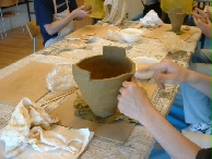 底から徐々に積み上げながら円錐形の土器を作り上げ、縄で文様を付けて出来上がり。